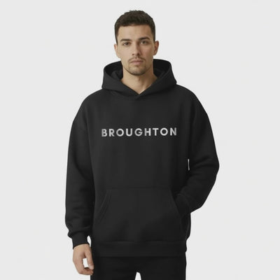 Broughton Signature ‘Premium’ oversized black hoodie. A tribute to Jack Broughton, the father of boxing, who changed the game. Luxury boxing apparel, crafted from a breathable cotton-poly mix, it offers a relaxed fit and a sturdy, heavyweight construction. Details include a roomy front pocket and ribbed trim.
